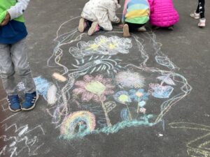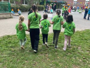 Die meisten Kinder kamen zum Weltkindertag in ihrem Waldschul-T-Shirt. Gemeinsam sangen alle auf dem Schulhof voller Inbrunst den Waldschulsong. Nach der theoretischen Auseinandersetzung konnte nun am 24.09.25 das Spielefest starten. Auf dem bunt geschmückten Schulhof standen zahlreiche Spielmöglichkeiten wie 4 Gewinnt in XXL, Federball, Entenangeln, Sandspielzeug und vieles mehr bereit. Das Highlight war die Slackline, an der viele Kinder ihre motorische Geschicklichkeit ausprobieren wollten. Zur Freude aller Kinder gab es den ganzen Vormittag über frisch gebackenes Popcorn. Am Ende des Festes war der gesamte Schulhof mit bunter Kreide angemalt. Sogar eine eigene Tanzfläche hatten einige 2. KlässlerInnen gemalt und tanzten dort ausgelassen zur Musik.