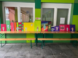 Verschmutzte Toiletten, Papier und Pippi auf dem Boden – das kennt wohl jede Schule. Daher hat die Waldschule Troisdorf überlegt, wie man die Toiletten sauberer halten kann und diese verschönert werden können. Daraufhin gestalteten die Klassensprecher Leinwände mit leuchtenden Farben und dekorierten diese mit „Toilettenbildern“ und ihrem jeweiligen Klassentier. Diese Bilder hängen nun in den Toilettenräumen der Mädchen und Jungen.