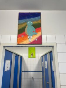 Verschmutzte Toiletten, Papier und Pippi auf dem Boden – das kennt wohl jede Schule. Daher hat die Waldschule Troisdorf überlegt, wie man die Toiletten sauberer halten kann und diese verschönert werden können. Daraufhin gestalteten die Klassensprecher Leinwände mit leuchtenden Farben und dekorierten diese mit „Toilettenbildern“ und ihrem jeweiligen Klassentier. Diese Bilder hängen nun in den Toilettenräumen der Mädchen und Jungen.